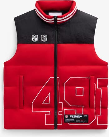 This Off Season x NFL Team Puffer Vest features intricate San Francisco 49ers embroidery, jacquard detailing, and striking 3D silicone patches. Designed for both style and performance, it boasts a corduroy lining, and a padded polyester fill for superior warmth and insulation. With double interior pockets for added convenience, this San Francisco 49ers vest ensures you stay comfortable and stylish on or off the field.
