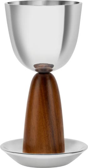 This sculptural Kiddush cup crafted with warm acacia wood against the shining Nambé alloy lends a beautifully contemporary design accent to your Shabbat table.