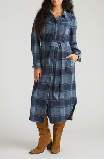 This seasonal-staple shirtdress is made from cozy stretch flannel in a curved-hem cut that keeps movement easy and footwear a featured part of your ensemble.