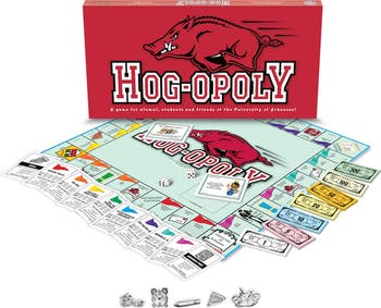 This University of Arkansas Hog-Opoly Board Game is perfect for Arkansas alumni, students and future grads. Game pieces include an alarm clock, pencil, gym shoe, bicycle and graduation cap tokens. Game spaces feature popular campus and off-campus locations for board spaces such as The Pig Trail, Wooo pig Soieee. Fulbright dining hall and razorback road. Also includes relevant contingency cards. Late for the Sky University of Arkansas Hog-Opoly Board Game is designed for all ages, Adults and Children.