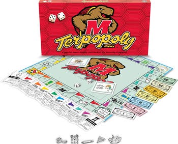 This Terp-Opoly board game is perfect for University of Maryland alumni, students and future grads. Game pieces include: alarm clock, pencil, gym shoe, bicycle, and graduation cap. Board Spaces include Knox road, Comcast center, Cole field house, the mall, and campus drive. Late for the Sky Terp-Opoly Board Game is designed for all ages, Adults and Children.