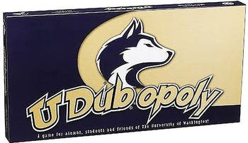 The UDUBOPOLY board game is ideal for University of Washington alumni, students, and future graduates. Game tokens feature an alarm clock, pencil, gym shoe, bicycle, and graduation cap. The board spaces are named after iconic locations such as Denny Hall, The Hub, Frosh Pond, By George, and U Village. Players can opt for traditional gameplay or a quick one-hour version.