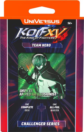 THE KING OF FIGHTERS XV: CHALLENGER SERIES DECK - TEAM HERO - Another fighting game joins UniVersus. THE KING OF FIGHTERS XV arrives with Challenger Series decks built around the series’ signature team-based combat. Drawing inspiration from KOF’s classic 3-on-3 format, this release introduces a new way to play UniVersus while staying true to the fast pace and high-pressure decisions fans expect. Choose your side. Choose your fighters. See how your team stacks up. TEAM HERO features Benimaru, Shun’ei, and Meitenkun, and focuses on staying on the offensive and keeping the pressure on your opponent. Fully compatible with the UniVersus card pool and designed for head-to-head play right out of the box. Each THE KING OF FIGHTERS XV: Challenger Series deck is a complete, ready-to-play 60-card build designed to get you into real matches immediately. EVERY DECK INCLUDES: -A full 60-card, tournament-legal Challenger Series deck -Three character options to choose from in each deck -A learn-to-play guide and card checklist booklet -One Collector Booster Pack containing 6 foil or alternate-art cards from the KOF XV Challenger Series. Whether you’re picking up UniVersus for the first time or diving into a new format, everything you need to start playing is right in the box—no extra setup required. Every Challenger Series deck includes a THE KING OF FIGHTERS XV Collector Booster Pack. Inside are six foil or alternate-art cards pulled from the set. These cards are great for tuning your deck, swapping in standout versions of your favorites, or adding something special to your collection alongside your Challenger Series build.