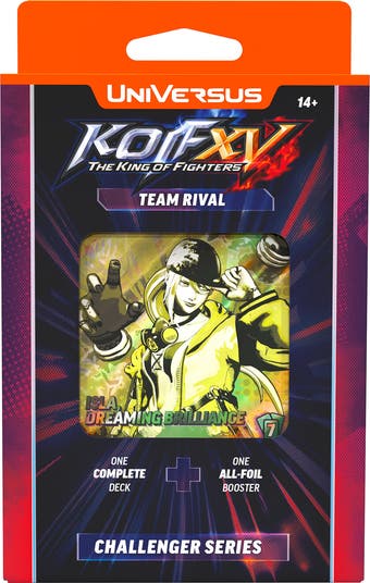 THE KING OF FIGHTERS XV: CHALLENGER SERIES DECK - TEAM RIVAL - Another fighting game joins UniVersus. THE KING OF FIGHTERS XV arrives with Challenger Series decks built around the series’ signature team-based combat. Drawing inspiration from KOF’s classic 3-on-3 format, this release introduces a new way to play UniVersus while staying true to the fast pace and high-pressure decisions fans expect. Choose your side. Choose your fighters. See how your team stacks up. TEAM RIVAL features Dolores, Isla, and Heidern, and rewards timing, control, and smart decision-making. Fully compatible with the UniVersus card pool and designed for head-to-head play right out of the box. Each THE KING OF FIGHTERS XV: Challenger Series deck is a complete, ready-to-play 60-card build designed to get you into real matches immediately. EVERY DECK INCLUDES: -A full 60-card, tournament-legal Challenger Series deck -Three character options to choose from in each deck -A learn-to-play guide and card checklist booklet -One Collector Booster Pack containing 6 foil or alternate-art cards from the KOF XV Challenger Series. Whether you’re picking up UniVersus for the first time or diving into a new format, everything you need to start playing is right in the box—no extra setup required. Every Challenger Series deck includes a THE KING OF FIGHTERS XV Collector Booster Pack. Inside are six foil or alternate-art cards pulled from the set. These cards are great for tuning your deck, swapping in standout versions of your favorites, or adding something special to your collection alongside your Challenger Series build.