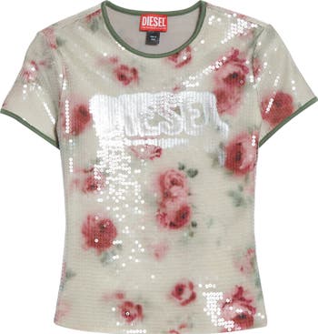 Blurred blooms and a faded logo bring the brand's casual edge to a tight T-shirt covered in transparent sequins.