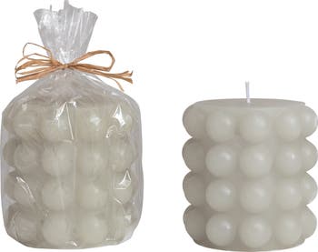 This intricately carved pillar candle showcases a striking hobnail design; 100% Paraffin Wax; 4" L x 4" W x 4" H