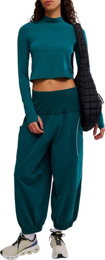 Whether you're on the move or simply lounging, stay comfortable in this matching set featuring a cropped, streamlined T-shirt with thumbhole cuffs. It's paired with wide-leg sweatpants that have exaggerated patch pockets, creating a bold contrast to the sleek silhouette of the T-shirt.