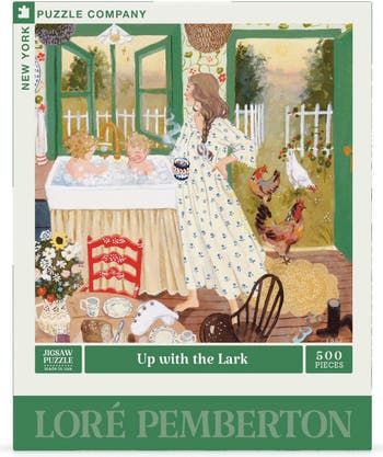 Capture the beauty of a serene summer morning with the Up With The Lark 500 Piece Jigsaw Puzzle, illustrated by the talented Lore Pemberton. This heartwarming puzzle showcases a tender moment as a young mother enjoys her morning coffee while bathing her twin babies in the kitchen sink. The sunlight streams through an open window, and the scene is alive with the soft hues of summer, the warmth of family life, and the playful presence of chickens scurrying across the floor.\r\n\r\nPerfect for a relaxing afternoon or quality time with loved ones, the Up With The Lark Jigsaw Puzzle brings the magic of a simple summer morning to life. Whether you’re a puzzle enthusiast or looking for a thoughtful gift, this delightful scene is sure to brighten your day. Order now and experience the joy, one piece at a time!