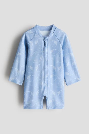 Textured swimsuit in UV-protective fabric with UPF 50. Small stand collar, long raglan sleeves, short legs and a zip down the front with an anti-chafe chin guard.