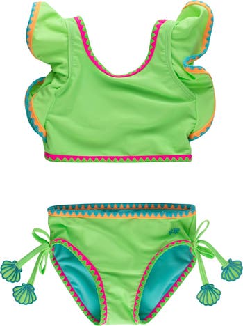 A butterfly-inspired tankini with crochet trim in bright neon pink. Soft, flexible, and perfect for swim and play.