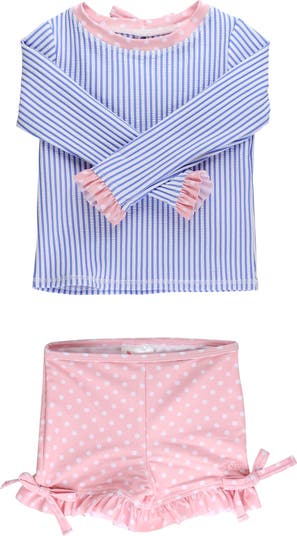 Seersucker Long Sleeve Rash Guard Ruffle Shorts 2-Piece Swimsuit. Ideal for girls who love the water, this swimsuit combines style and functionality. Featuring a seersucker rash guard with long sleeves, this set ensures excellent sun protection with UPF 50+ while maintaining a trendy look with adorable ruffle details on the shorts. The ruffle shorts enhance the playful design, making it a perfect pick for beach days or poolside fun. Not only does this 2-piece swimsuit for girls offer full coverage, but it also supports all-day comfort with 4-way stretch fabric that resists snagging and pilling, keeping the swimsuit looking great even after multiple uses. Dive into summer with this stylish, durable, and sun-protective girls' beachwear.