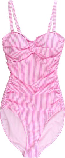 This seersucker women's bandeau one-piece features a convertible design for multiple looks, offering comfort and bright style.