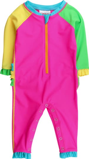 Dive into style and sun protection with this vibrant swimsuit, perfect for active girls who love to splash and play. Designed with a convenient zipper and snaps closure, this long sleeve rash guard offers enhanced UV protection, keeping your little swimmer safe from the sun's rays. The unique 4-way stretch fabric ensures a comfortable fit that moves with her, while resisting pilling and snagging to maintain its fresh look throughout the season. The adorable ruffles at the rear add a playful touch to this protective swimwear for girls, making it as stylish as it is functional. Ideal for beach days or pool sessions, this full length swimsuit for girls is a must-have for her summer wardrobe.