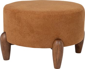 Add the Terracotta Bouclé Upholstered Ottoman with Tapered Mango Wood Legs to interiors that embrace warmth, texture, and versatility. This inviting round ottoman features a plush terracotta bouclé fabric with a nubby, dimensional surface that adds depth and softness to any room. Its base is crafted from solid mango wood with four tapered legs in a warm walnut tone, positioned outward for stability and visual balance. Perfect for Farmhouse, Lodge, Cabin, Contemporary, and Coastal spaces, it serves as a stylish footrest, extra seat, or decorative accent. Made of durable polyester upholstery and natural mango wood, it offers lasting comfort and artisan appeal. Measures 27 inches in length and width, and 16 inches in height, it is ideal for layering into intimate or open-plan layouts. It's a cozy yet sculptural piece that brings grounded elegance to everyday living.
