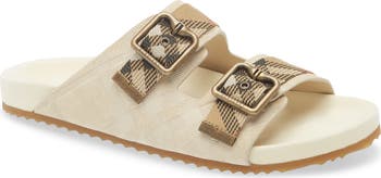 The iconic checks are double featured on the buckled straps and embossed surface of this slide sandal fitted with an anatomically contoured footbed.