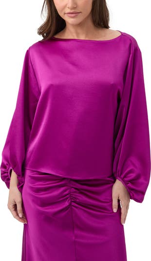 Boat neck satin blouse with long balloon sleeves and relaxed fit