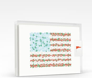 This 8-pack of greeting cards is elegantly illustrated by artist Ingrid Ramus, founder and owner of the Ramus & Co brand. Artwork features a US flag made of flowers. All greeting cards are made in the USA on heavyweight uncoated and locally-sourced and manufactured card stock. Each card is accompanied by a hand-embossed envelope made with heavyweight 95lb paper and a peel-and-stick flap - no licking envelopes here! All Ramus & Co. greeting cards are printed on FSC and SFI certified paper sourced from a regional mill that harnesses 66% of its energy from on-site sustainable sources, such as emission-free hydroelectricity and biomass co-generation from wood waste. All 8 greeting cards come packaged as a boxed set. Husband-and-wife team Calvin and Ingrid Ramus founded Ramus & Company in 2019, in New England, USA. Ingrid, the creative designer behind the brand, originates from Mexico, where she cultivated her skills in fashion and textile design. Drawing from her unique and inquisitive perspective on preppy style, Ingrid prolifically designs whimsical yet classic stationery and lifestyle items.