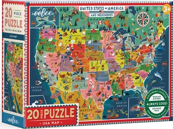 EEBOO USA MAP 20-PIECE PUZZLE. A detailed and carefully researched pictorial map of the United States by artist Uta Krogmann, filled with landmarks, industry, and geographical features. eeBoo’s USA Map puzzle offers an engaging and educational introduction to the geography and culture of the United States. Perfect for young explorers, this puzzle introduces children to U.S. geography, promotes visual memory and concentration, and encourages screen-free learning. 15 x 11" Assembled size. Made with durable, dustless, double-coated pieces from FSC-certified recycled board and printed with vegetable-based inks, this puzzle is safe, sustainable, and ideal for hands-on educational fun. Woman Owned Mother Run: For over three decades we have made quality, beautiful games and activities that reflect our personal commitment to family, community, cooperation, inclusion, respect, and the power of honest communication. eeBoo celebrates the gloriousness of diversity and difference. Our thoughtfully designed products respect the intelligence, curiosity, and needs of people.