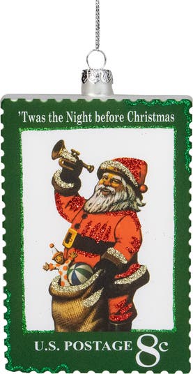 Add this officially licensed USPS ornament to your home for the holidays. This gorgeous ornament would be the perfect finishing touch to your tree. Perfect to match any already existing Christmas decor. Product Features: USPS stamp Christmas ornament Features green, red and gold glitter One-sided, flat back ornament Comes in the shape of a stamp Features Santa with a bell and a sac of gifts Ornament says “Twas the night before Christmas” and "U.S. Postage 8" Comes ready-to-hang on a silver cord Recommended for indoor and decorative use only Dimensions: 3.5"H x 1"W x 2.5”D Material(s): glass