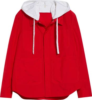 This jacket reads crisp at first glance, then the details start working: a contrast hood that detaches with buttons, patch pockets that reinforce the utilitarian appeal and a hidden-snap placket that keeps hardware out of sight.