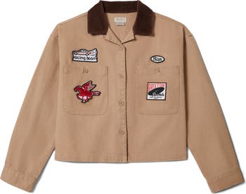 A soft cord collar adds texture and contrast to this boxy cotton jacket stitched with sporty logo patches for vintage-inspired charm.