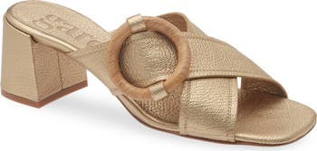 A circular wood ornament highlights the crisscrossing straps on a Spanish-made leather sandal lifted by a low block heel.