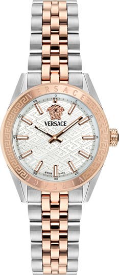 Logomania overtakes an opulent bracelet watch, from the Greek-key–engraved bezel to the 3D-look face with a Medusa-head icon at high noon.