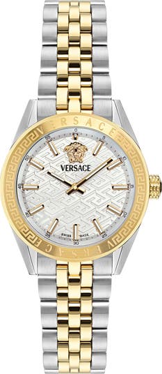 Logomania overtakes a two-tone bracelet watch—from the Greek key–engraved bezel to the labyrinthine guilloche dial, while a 3D Medusa head take up its favored high noon position.