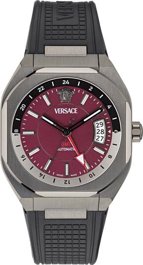 A brushed-finish case and heavy-duty silicone strap bring rugged durability to this Swiss-automatic timepiece detailed with a house-signature Medusa head.
