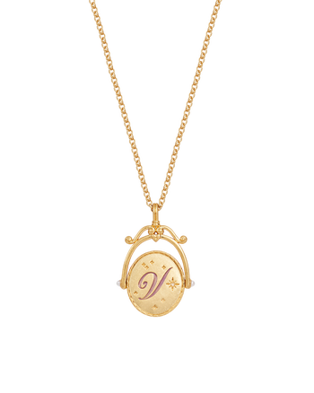 Our vintage style gold spinner initial necklace makes a wonderful gift or treat yourself as an act of self-love. Set in 22ct worn gold brass, on one side you'll find your 'V' initial engraved in a beautiful scroll font, on the other side, a hand-painted violet flower. Representing modesty and humility, it will take centre stage in any jewellery collection.