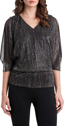Shimmering metallic threads are the star of the show on this eye-catching top detailed with dazzling rhinestones on the cuffs.