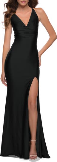 V Neck Jersey Fitted Prom Dress with Tie Up Back