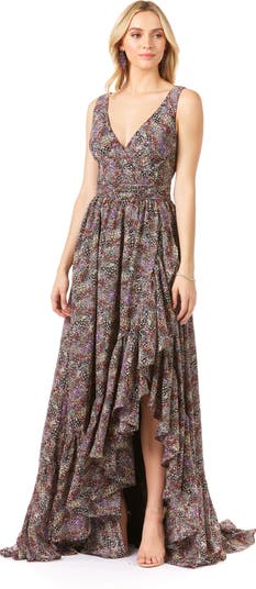 V-Neck Long Print Gown Hi-Low Wrap
