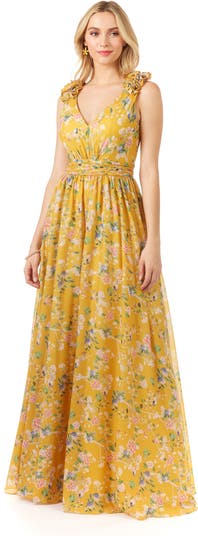 An A-line print gown with v-neck-straps in a yellow-based floral pattern. It's cinched at the waist with flower details at the shoulders. It is a soft and sweet gown for any day event or warmer weather fun