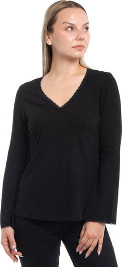V-Neck Long Sleeve Empire Seam Trapeze Tee with Lace Trim Softly feminine and effortlessly flattering, this trapeze tee features delicate lace details that add a touch of romance to your everyday style. Designed in our signature slub fabrication for a textured yet lightweight feel. Flowy trapeze silhouette with empire seam for a flattering drape Delicate lace trim (80% Nylon, 20% Spandex) adds an elegant finish V-neckline and long sleeves for versatile styling Crafted in our signature slub fabric for comfort and texture Imported Machine washable Model is wearing a size Small