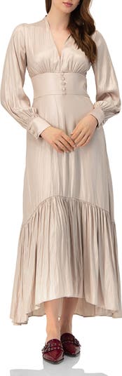 Elegant long sleeve maxi dress with a V-neckline and front buttons.