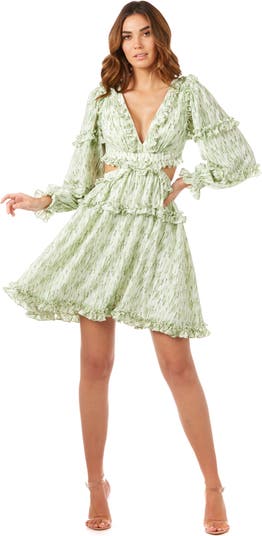 V-Neck Long Sleeve Print Cocktail Short with Cutout and Lace Up Back