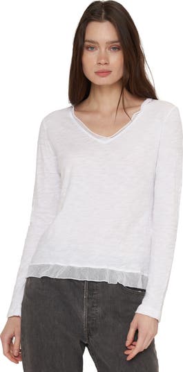 V-Neck Long Sleeve Tulle Mix Tee A feminine twist on a casual favorite, this long sleeve tee features delicate tulle accents for an elevated everyday look. Crafted in our Signature Slub Fabrication for a soft, textured feel. This style runs small — we recommend sizing up