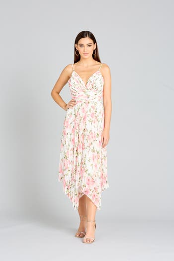 WOW! We've been working on this printed collection for so many months and we're finally able to reveal one of our favorites :(. This midi length pleated print dress features spaghetti straps and v-neckline. The a-line skirt is full of pleats and expands to show floral details.