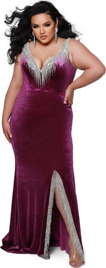 Johnathan Kayne for Sydney's Closet V-neck Rhinestone Fringe Velvet Plus Size Evening Gown, Main, color, Purple