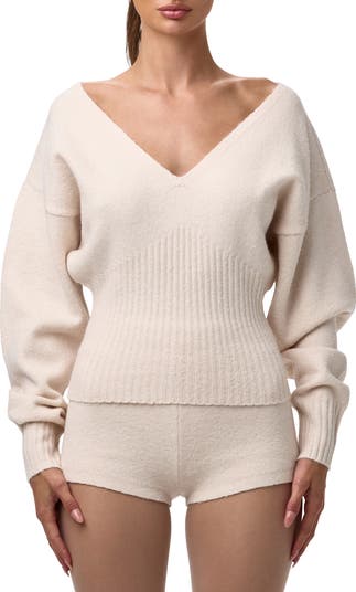 Ribbed stitching defines the waist of this V-neck sweater styled with slouchy sleeves that can be worn on or off the shoulders.