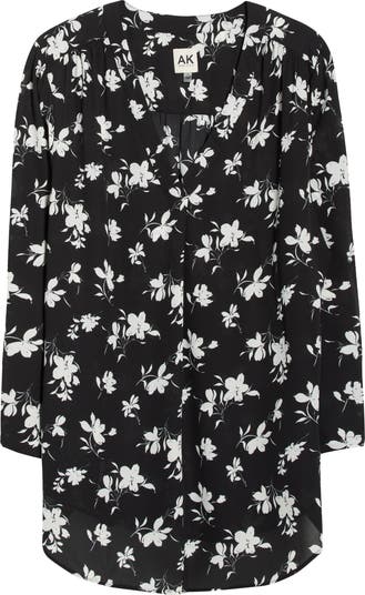 Dainty blooms pop against the dark background of this V-neck top finished with a tuckable hem.