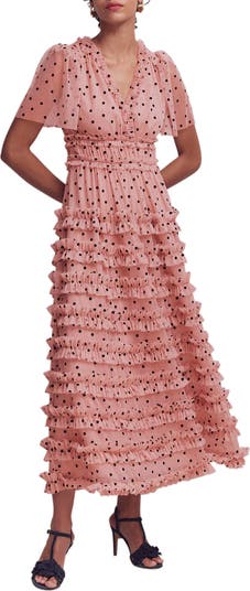 Retro polka dots brighten up this gauzy tulle dress complete with a skirt of tiered ruffles.