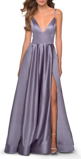 La Femme V-Neck Satin Prom Dress with Lace Up Back, Main, color, Lavender/Gray