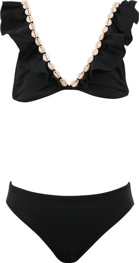 This striking jet-black bikini features a sophisticated deep V-neck top, beautifully defined by voluminous ruffled straps that drape gracefully over the shoulders. The design is elevated by a row of hand-finished cowrie shells along the ruffle edges, paired with classic matching bottoms for a high-fashion, boutique-inspired finish.