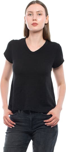 V-Neck Short Sleeve Baby Tee Crafted in our signature slub fabric for a soft, lightweight feel and a flattering drape. Designed with a slim, baby tee fit that pairs effortlessly with denim, skirts, or layered looks. Slim fit Soft slub fabric 100% Cotton Made in the USA & Imported Machine washable Model is wearing a size Small