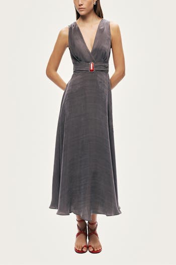 A refined sleeveless midi dress featuring a softly contoured V neckline and a fluid, feminine silhouette. Designed to gently shape the waist and flow effortlessly toward the hem, this style offers understated elegance with a modern touch.