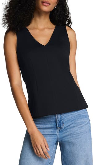 Smooth darts create sleek shape for this sleeveless top made with abbreviated side slits.