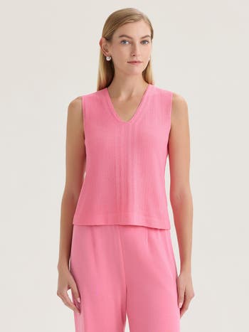 This V-neck tonal pointelle knit tank offers an elevated essential for spring layering, combining a refined texture with a flattering, feminine neckline. Lightweight and breathable, it pairs effortlessly under matching jackets or worn alone with coordinating bottoms for a polished warm-weather look. Machine washable and endlessly versatile, it’s a chic foundation for spring occasions and daytime events.