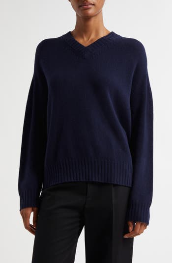 A slightly oversized silhouette surrounds you with cozy comfort in this V-neck sweater knit from soft virgin wool and cashmere.